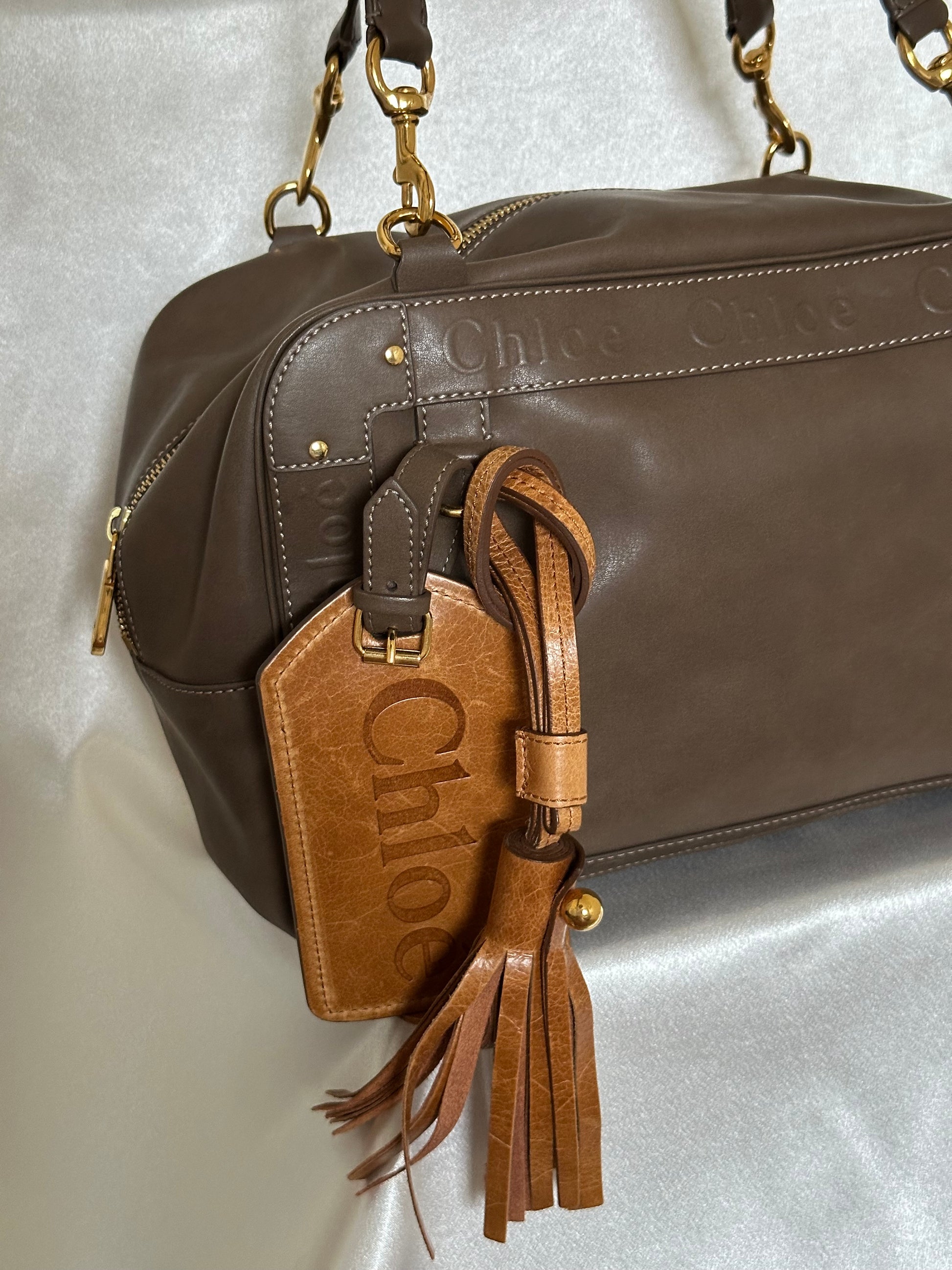 Chic everyday Chloé shoulder bag in smooth brown leather with embossed logo detailing and gold-tone hardware. Features a top zip closure and comes with a detachable leather tassel charm and logo tag. Timeless, easy-to-style piece that works day or night.